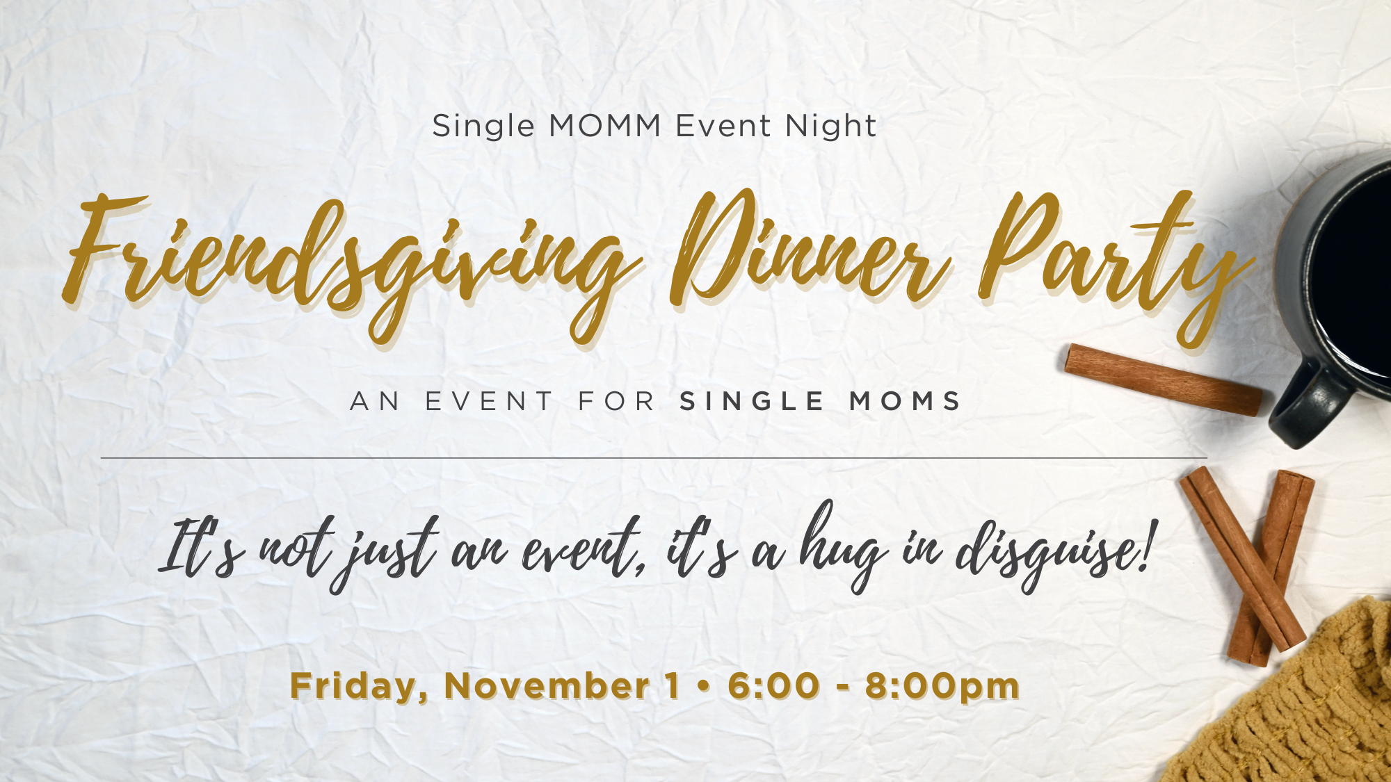 Are you a single mom? Join us for a Friendsgiving Dinner! An evening with a hot drink waiting for you, the smell of fall in the air, and space to relax and enjoy the company of a room full of inspiring single moms like you. Event Nights by Single MOMM is a place where tired, overwhelmed, and alone do not exist. Together, we share a beautiful meal, drop our kids off in a childcare program led by caring volunteers, laugh, listen to inspiring speakers, and build friendships. Please RSVP below to save your seat for this event. Free childcare program from infant - 16 years.